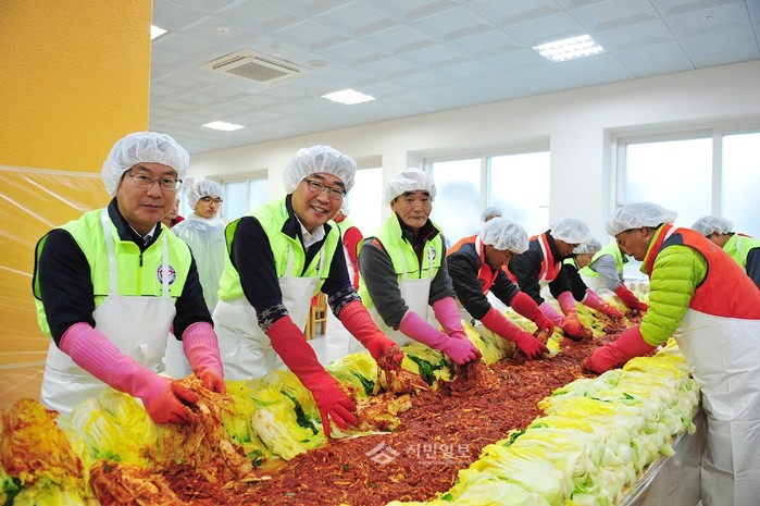 24일 경기 여주시 지역내 기관장 및 사회지도층으로 구성된 여주시 노블리스오블리제 봉사단원과 일반자원봉사자 80여명이 참여한 '사랑의 김장 만들기 자원봉사활동'에서 원경희 시장과 참가자들이 김치를 담그고 있다. (사진제공=여주시청)