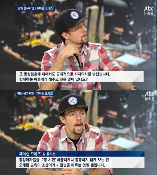 그러자 손석희 앵커는 "음악이 세상을 바꿀 수 있다고 믿냐?"고 물었고, 제이슨 므라즈는 "그렇다"고 답했다.