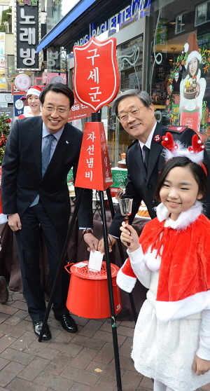 25일 서울 종로구 명륜동 파리바게뜨 대학로점 앞에서 열린 구세군 1호 성금 전달식에서 파리바게뜨 이재강 상무, 한국구세군 이수근 사무총장이 전달식을 마치고 모델들과 사진촬영을 하고 있다. 파리바게뜨는 연말까지 한국구세군으로부터 전달받은 미니 자선냄비를 전국 매장에 설치하고 모금활동을 통해 모인 금액을 구세군에 전달한다.