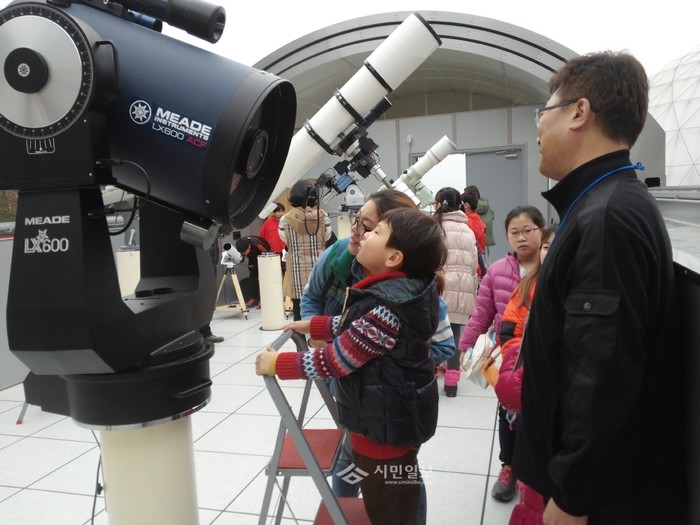 최근 경기 포천시 소흘도서관은 지역내 다문화센터, 지역아동센터 이용 아동들과 함께 '누리보듬 독서교실 프로그램'의 일환으로 포천아트밸리 천문과학관을 방문해 별자리 강의, 천체망원경 관측 등으로 구성된 현장학습을 실시했다. 사진은 천체망원경으로 하늘을 관찰하는 참여 아동의 모습. (사진제공=포천시청)