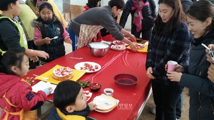 지난 22일 경기 양평군 농업기술센터가 어린농부딸기체험농장을 방문한 방문객들을 대상으로 딸기잼·딸기와인·초코딸기·딸기 생크림케이크 등을 만들며 즐길 수 있는 '팜 파티(Fram party) 행사'를 열었다. 사진은 딸기 생크림케이크를 만들어보는 참여자들의 모습. (사진제공=양평군청)