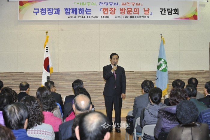 지난 24일 서울 서대문구 북가좌1동 주민센터에서 100여명의 지역주민이 참석한 가운데 문석진 구청장이 지역 현안문제를 주제로 주민과 함께 자유토론을 진행했다. 사진은 이날 동 주민센터를 방문한 문 구청장이 토론에 앞서 주민들에게 인사말을 하고 있는 모습. (사진제공=서대문구청)
