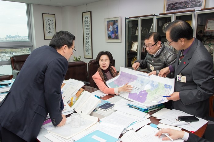 지난 25일 김수영 양천구청장이 국회 국토교통위원회 소속 정성호 의원을 방문해 양천구를 포함한 김포공항 인근지역의 소음현황에 대해 설명하며 국제선 증편 움직임이 철회될 수 있도록 요청했다. 사진은 정 의원(왼쪽)에게 양천구의 현황을 설명하는 김 구청장(왼쪽에서 두 번째)의 모습.(사진제공=양천구청)