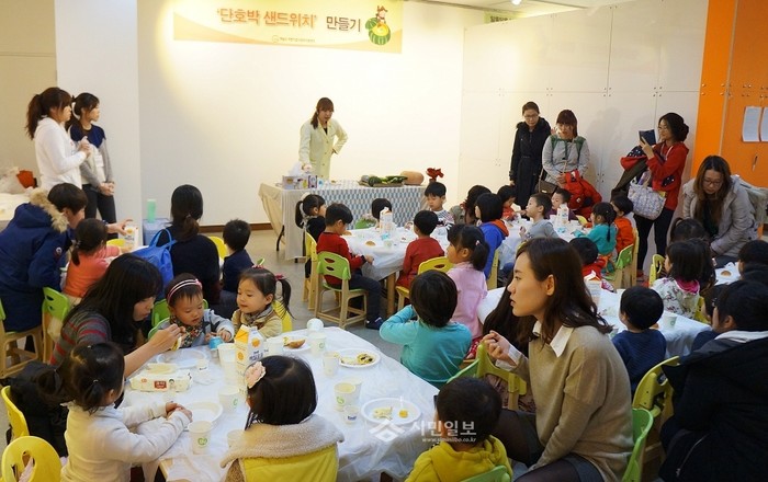 최근 경기 하남시가 어린이들이 올바른 식습관을 지닐 수 있도록 돕기 위해 편식예방 인형극, 단호박샌드위치 만들기, 전시회 등으로 구성된 '영양별 건강별 오감놀이터'를 개최했다. 사진은 이날 행사에 참여한 어린이들이 직접 단호박샌드위치를 만드는 모습.(사진제공=하남시청)