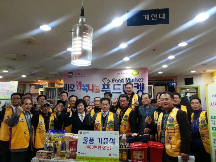 서울 마포구가 운영하는 '마포행복나눔푸드마켓 1호점'은 최근 서울뉴오성라이온스클럽과 성품 기탁식을 진행했다. 사진은 푸드마켓 1호점을 방문한 서울뉴오성라이온스클럽 관계자들이 400만원 상당의 식품을 기탁한 후 기념촬영을 하고 있는 모습. (사진제공=마포구청)