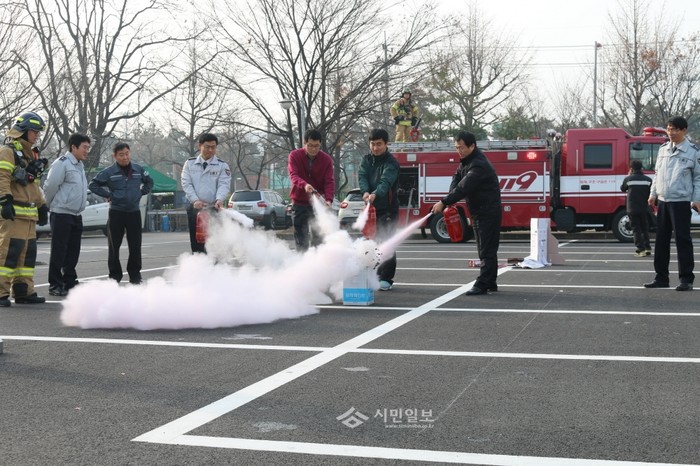 인천 중부경찰서는 27일 오전 10시 겨울철을 맞아 건조해진 날씨로 인한 화재 발생률이 높아짐에 따라 화재발생시 효율적인 화재진압을 위한 '2014년 합동소방훈련'을 전직원이 참여한 가운데 중부소방서와 함께 실시했다. 사진은 이날 훈련에 참가한 경찰서 직원들이 소화기를 사용하고 있는 모습. (사진제공=중부경찰서)