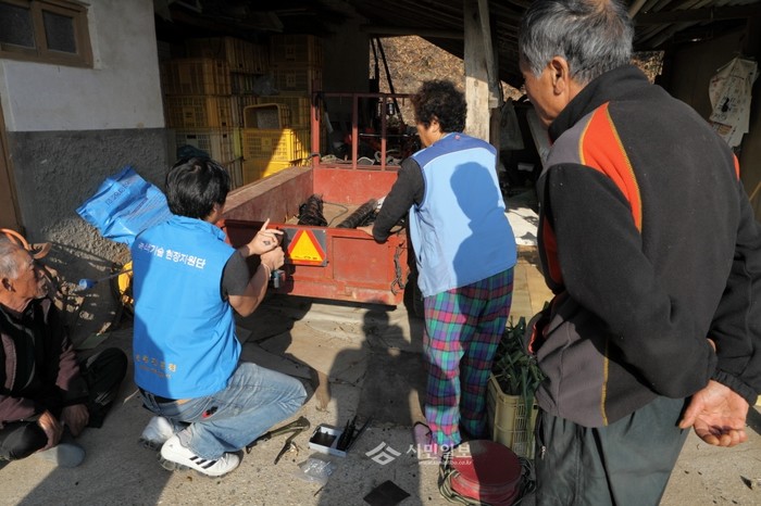 지난 26일 경기 이천시는 대월면 군량 2리 마을회관에서 농촌진흥청, 국토교통부, (주)한국3M 등과 함께 ‘농촌지역 교통안전 지원사업’의 일환으로 지역내 농가에서 운행하고 있는 경운기 및 트랙터 등 20여대에 후방 반사표지판을 부착했다. 사진은 이날 농기계에 후방 반사표지판을 부착하는 농촌진흥청 관계자의 모습. (사진제공=이천시청)