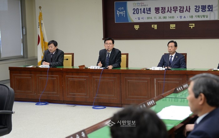 서울 동대문구가 지난 25일 오후 2시 구청 기획상황실에서 ‘동대문구의회 2014년 행정사무감사 강평회’를 열었다. 사진은 강평회에 참석한 유덕열 구청장이 인사말을 하고 있는 모습. (사진제공=동대문구청)