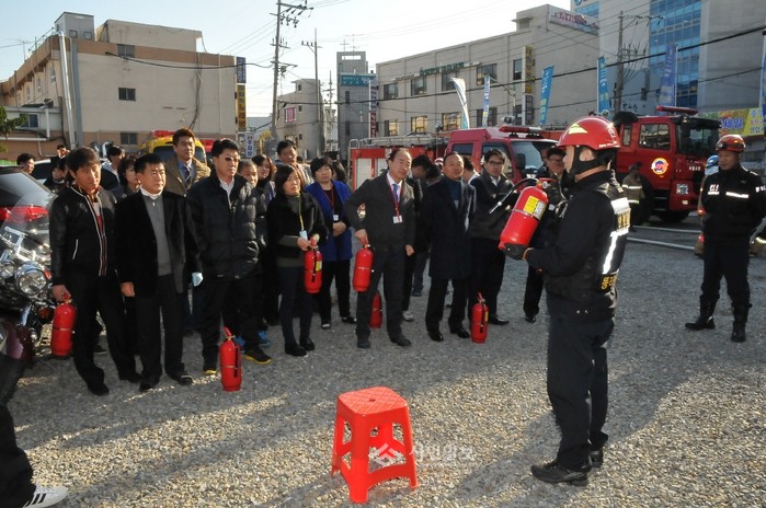 서울 동작소방서는 지난 26일 동작구 신대방동에 위치한 '세창디앤씨' 아파트 모델하우스에서 겨울철 화재안전대책의 일환으로 화재예방을 위한 훈련을 실시했다. 사진은 모델하우스 관계자들을 대상으로 화재시 초동진압 대응 요령교육을 실시하고 있는 모습 (사진제공=동작소방서)