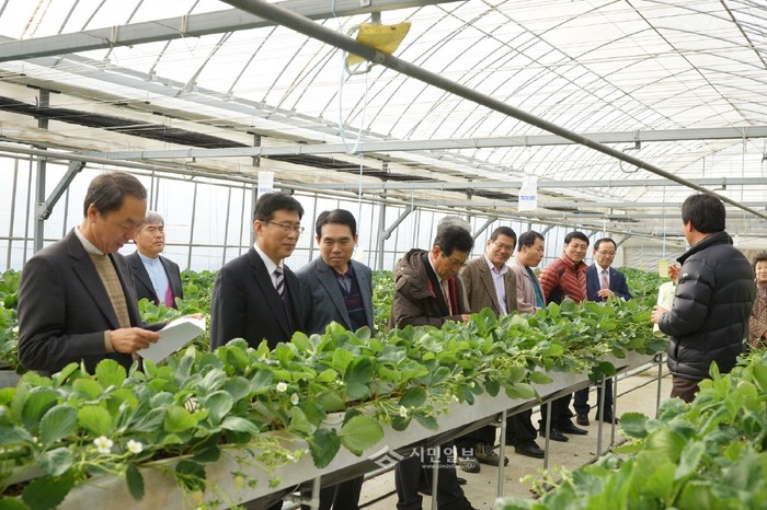 경기 용인시는 27일 농업기술센터에서 농업산학협동심의 위원 20명이 참석한 가운데 ‘2014년도 농업산학협동 평가회’를 개최하고 시범사업의 성과를 확인하기 위해 시범사업 우수농가를 순회하며 현장평가를 실시했다. 사진은 이날 현장을 방문한 위원들의 모습. (사진제공=용인시청)
