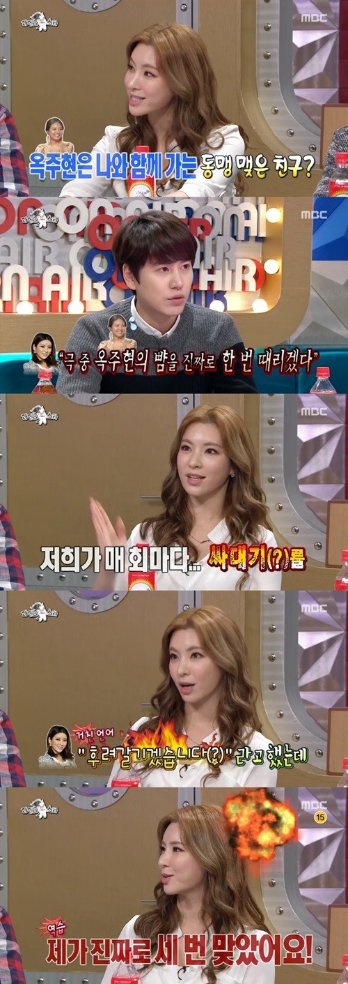 이에 MC 규현이 정선아에게 "한 인터뷰에서 '극중 옥주현의 뺨을 진짜로 한 번 때리겠다'라고 말한 적이 있냐"고 질문하자 정선아는 "'위키드' 공연에서 내가 매 회마다 뺨을 때리는 신이 있다. 장난삼아 '옥주현의 뺨을 때리겠다'라고 했는데 실제 공연 때는 내가 세 번이나 맞았다"라고 말해 보는 이들을 깜짝 놀라게 했다.