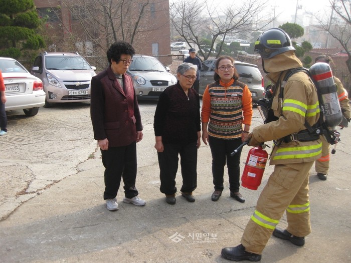 27일 인천중부소방서 영종119안전센터는 종교시설 관계인의 화재대응능력을 향상시키고 안전관리에 대한 관심을 증대시키고자 중구 중산동에 위치한 종교시설(사찰)인 정도사에서 소방훈련 및 소방안전교육을 실시했다. 사진은 사찰 관계자들이 소방관으로부터 소화기 사용법 교육을 받고 있는 모습 (사진제공=인천중부경찰서)