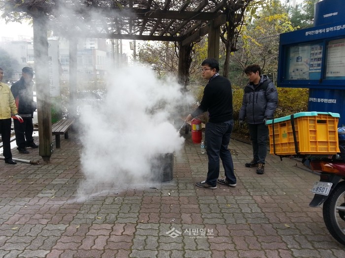 최근 경기 용인시 수지구 풍덕천1동 주민센터와 수지119안전센터는 합동으로 동 주민센터 주차장에서 합동소방훈련을 실시했다. 이날 훈련은 가상화재 발생을 시작으로 119신고, 소방차 출동 등으로 구성됐다. 사진은 점화된 연막탄에 소화기를 분사하며 훈련 중인 참여자의 모습. (사진제공=용인시청)