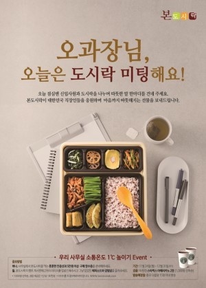프리미엄 한식 도시락 브랜드 본도시락(대표 김철호)은 <사무실 소통온도 1℃ 올리기> 캠페인의 일환으로 본도시락을 구매하는 직장인 고객을 위한 특별한 이벤트를 진행한다고 27일 밝혔다.
