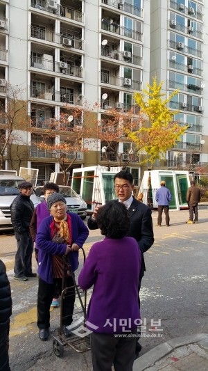최근 구본승 서울 강북구의원은 지역내 번동 주공2단지 영구임대아파트의 베란다 창틀 교체 공사현장을 점검하고, 창틀 교체에 대한 주민들의 현장민원을 듣고 공사업체 관계자와 협의했다. 사진은 주민들과 이야기하고 있는 구의원의 모습. (사진제공=강북구의회)