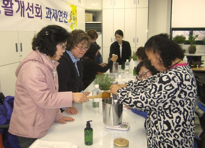 최근 경기 포천시는 탈모로 인해 고민하는 현대인들을 위해 각 읍·면·동 생활개선회원 260명을 대상으로 농업기술센터 농촌생활문화전수관에서 샴푸의 주원료인 계면합성제에 대해 공부하고 직접 천연샴푸를 만들어보는 '천연샴푸 만들기 과제연찬 교육'을 실시했다. 사진은 이날 천연샴푸를 만들고 있는 참가자들의 모습. (사진제공=포천시청)