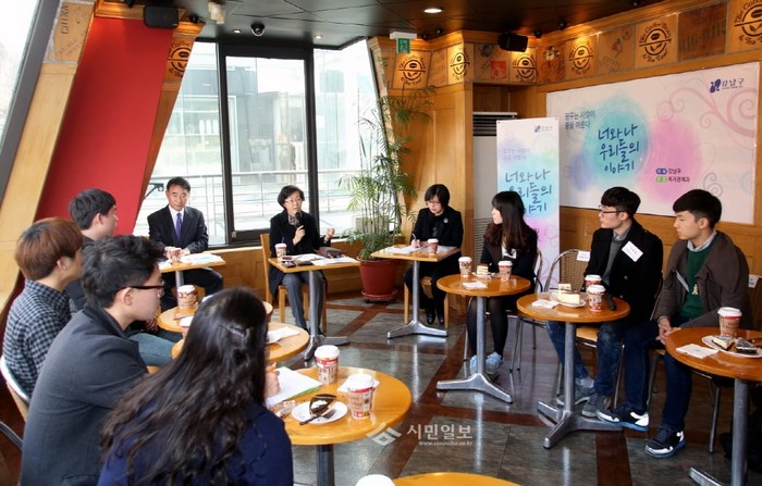 지난 11월29일 신연희 서울 강남구청장(가운데)이 오전 10시 강남구 청담동의 한 카페에서 학비, 청년취업 문제 등 청년들의 고충을 함께 나누기 위해 마련한 ‘너와 나 우리들의 이야기’에서 대학생들과 이야기를 하고 있다.(사진제공=강남구청)