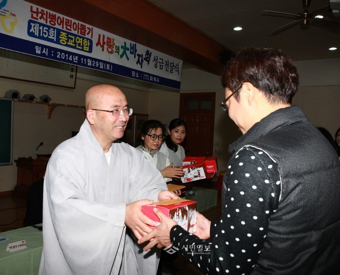서울 강북구가 지난 11월29일 오전 11시 수유동에 위치한 대한불교조계종 화계사에서 '제15회 난치병 어린이돕기 종교연합바자회 성금 전달식'을 열었다. 사진은 화계사 수암 주지스님이 성금과 선물을 전달하고 있는 모습. (사진제공=강북구청)