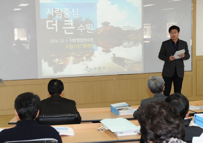 1일 염태영 경기 수원시장이 ▲수원의 현황과 특성 ▲수원형 거버넌스 사례 ▲수원시의 도시패러다임 정책과 지방분권의 필요성에 대한 내용으로 지방행정연수원 ‘제11기 고위정책과정’ 연수생 38명에게 ‘거버넌스 행정 특강을 펼치고 있다.(사진제공=수원시청)
