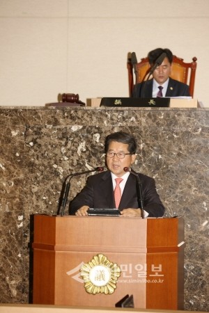 1일 조병돈 경기 이천시장은 이천시의회 '제164회 제2차 정례회'에 참석, 시정연설을 통해 2014년 업무현황과 앞으로 이천시가 나아가야 할 방향 등을 밝혔다. 사진은 이날 시정연설에서 내년에도 더욱 힘차게 나아가자고 포부를 밝히는 조 시장의 모습. (사진제공=이천시청)