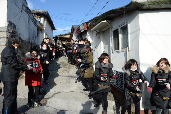 결혼정보회사 듀오의 3만번째 성혼 돌파를 기념해 박수경 듀오 대표(오른쪽 세번째), 커플매니저를 포함한 임직원들이 1일 서울 노원구 상계동 일대 연탄을 때는 가구에 3만개의 연탄을 기부, 영하권으로 떨어진 추위속에서 연탄을 나르고 있다.