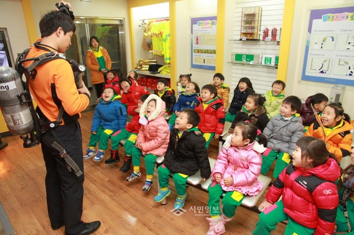 서울 구로소방서는 2일 오전 10시 금천구 독산로14길에 위치한 ‘초록둘리어린이집’의 원생 및 지도교사 등을 소방서 3층에 마련된 소방안전체험교실로 초청, ‘1일 병아리 소방관’ 체험학습을 실시했다. 사진은 이날 교육에 참가한 어린이집 원생이 소방장비 가운데 하나인 산소호흡기를 체험하고 있는 모습. (사진제공=구로소방서)