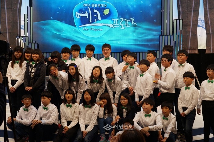경북 구미시 인희초등학교는 최근 서울 SBS 프리즌 타워에서 열린 ‘2014 물환경대상’ 시상식에서 ‘물환경대상 환경영상 콘테스트’ 부문 초등부 우수상을 수상하고 이번 대회를 축하하는 공연 무대를 펼쳤다. 사진은 이날 시상식에서 기념촬영을 하는 인의초 학생들의 모습. (사진제공=구미교육지원청)