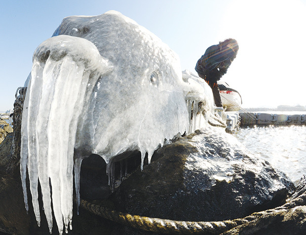 전남을 제외한 전국에 한파특보가 내려진 2일 오후 서울 낮 최고기온까지 영하권에 머물며 올 들어 가장 추운 날씨를 보인 가운데 뚝섬 한강공원에서 선착장에 꽁꽁 얼어붙은 고드름이 매달려있다.