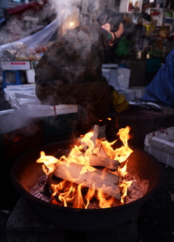 전국 곳곳에 한파주의보가 내려지며 매서운 추위가 기승을 부리는 2일 오전 서울 중구 중림시장에서 상인들이 모닥불을 피우고 추위를 녹이고 있다.