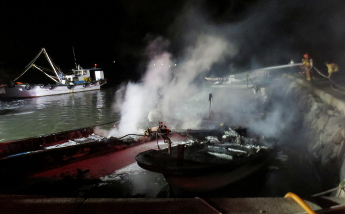 2일 오전 4시30분쯤 전남 고흥군 남양면 한 선착장에 정박 중이던 어선에서 불이 나 소방대원들이 진화하고 있다. 불은 바람을 타고 옆에 정박한 어선들로 옮겨 붙어 9척의 어선이 모두 불에 탔다. 전남 보성소방서 제공