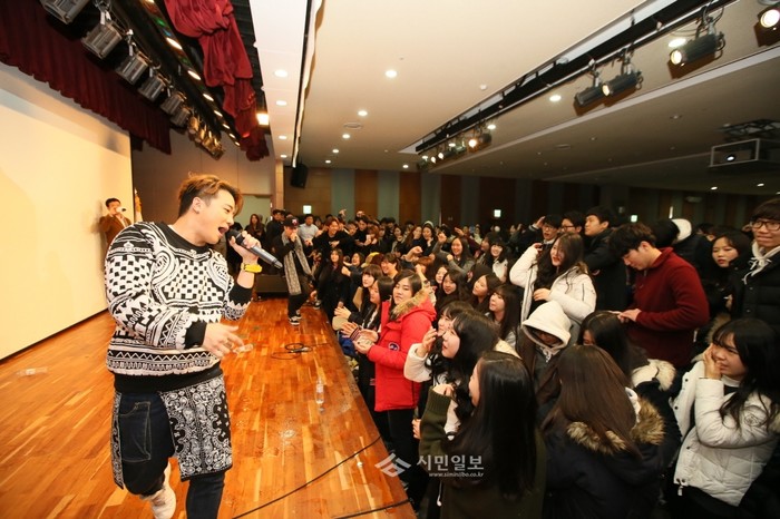 지난 2일 오전 서울 금천구는 구청 대강장에서 수험과 입시 스트레스에 시달린 고등학교 3학년 수험생들을 위해 '아웃사이더의 파란만장 상처공감 토크쇼' 아파쇼를 열었다. 이날 행사에는 400여명의 수험생이 참여했다. 사진은 가수 '아웃사이더' 의 공연을 관람 중인 학생들의 모습.(사진제공=금천구청)