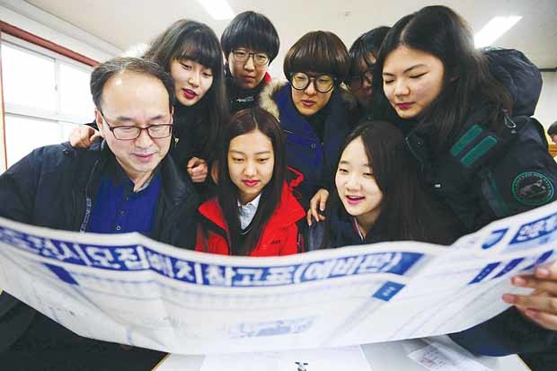 2015학년도 대학수학능력시험 성적표가 배부된 3일 오전 서울 종로구 풍문여자고등학교에서 수험생들이 성적표를 확인한 후 담임선생님과 정시모집 배치 참고표를 살펴보고 있다.
