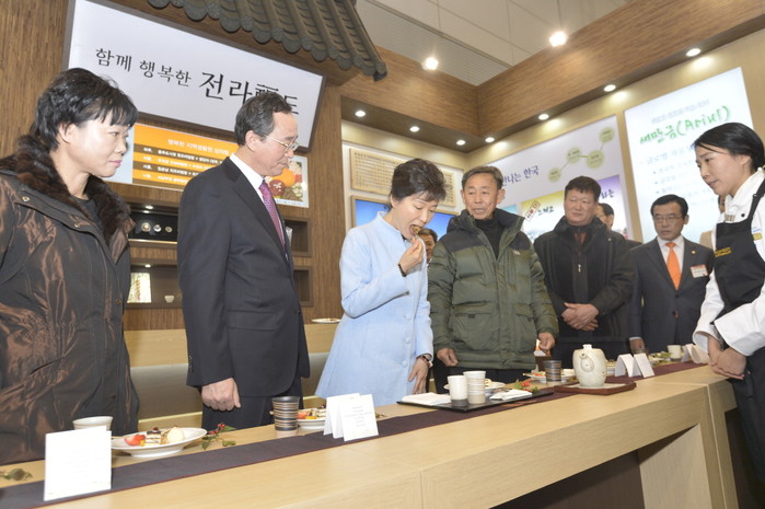 박근혜 대통령이 3일 오전 광주 서구 상무누리로 김대중컨벤션센터에서 열린 '2014 대한민국 지역희망 박람회 개막식'에 참석, 전라북도 전시관을 참관하며 로컬푸드 다과를 맛보고 있다.