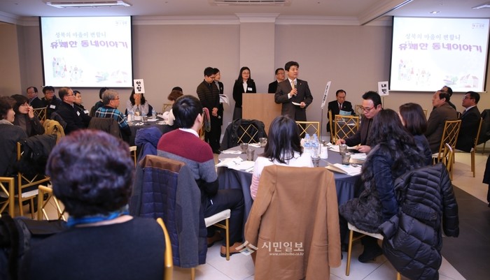 지난 3일 성북구 길음동에서 성북구 동 복지협의체 활동수기집 출판기념회 및 워크숍 '유쾌한 동네이야기'가 열렸다. 이 자리는 복지협의체 탄생과 운영, 성과, 향후 실천방향까지 살펴보고 그간의 우수 사례를 발표하기 위해 마련됐다. 사진은 이 자리에 참석한 김영배 성북구청장이 발언하는 모습. (사진제공=성북구청)