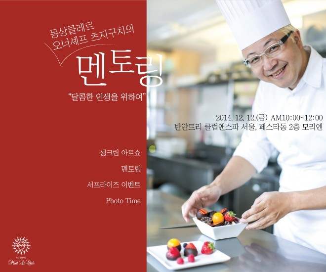 행사 참여신청은 몽상클레르 공식 페이스북 (www.facebook.com/MontStClair.kr)을 통해 오는 8일까지 “몽상클레르 오너셰프 츠지구치 멘토링” 페이스북 이벤트 ‘좋아요’를 누르고 이벤트 페이지 공유 및 친구 태그 후 댓글을 작성하면 응모되며, 이중 70명을 추첨, 츠지구치 멘토링 행사에 초청한다.