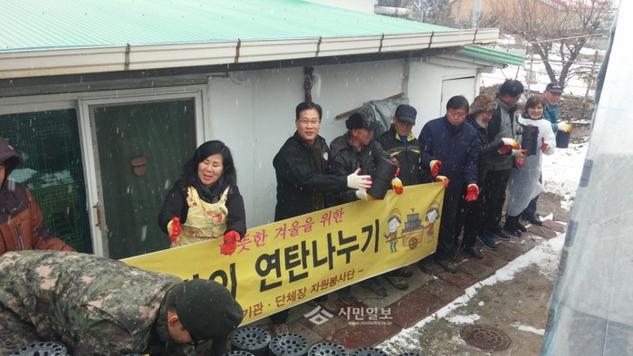 경기 여주시 능서면 기관·단체장 자원봉사단은 기관·단체장 20여명과 능서면 직원이 참여한 가운데 지난 3일 소외계층 2가구를 대상으로 '사랑의 연탄나누기' 봉사활동을 실시했다. 사진을 연탄을 나르고 있는 봉사자들의 모습. (사진제공=여주시청)