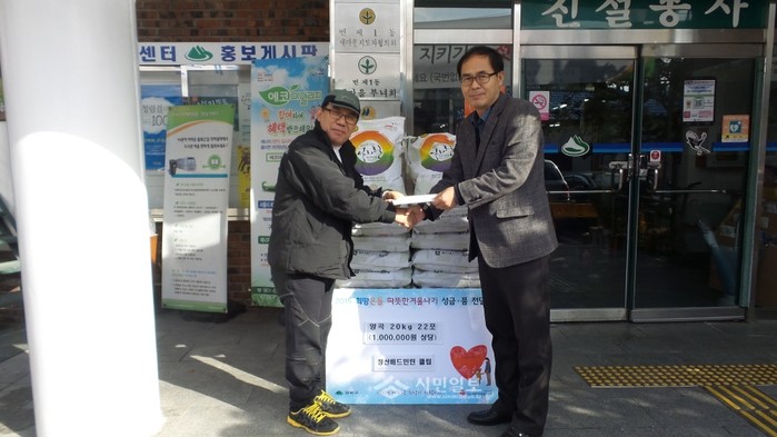 서울 강북구 청산배드민턴 클럽이 최근 어려운 지역주민을 위한 쌀 20㎏·22포를 번1동 주민센터에 기탁했다. 사진은 안광승 청산배드민턴클럽 고문(왼쪽)이 우종훈 번1동장에게 사랑의 쌀을 전달하고 있는 모습. (사진제공=강북구청)