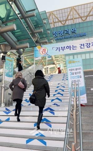 서울 동대문구는 한국마사회동대문지사, 한국철도공사 청량리역과 손을 잡고 청량리역 1번 출구에 '건강 디딤돌, 동대문구 기부하는 건강계단 조성사업'을 완료하고 4일 오후 2시 청량리역 광장에서 준공식을 진행했다. 사진은 계단을 오르는 시민들의 모습. (사진제공=동대문구청)