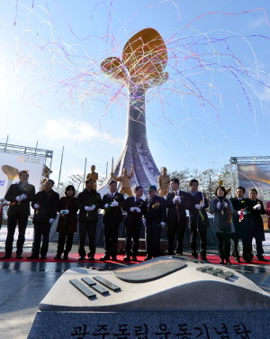 5일 오전 광주 서구 상무시민공원에서 선열들의 숭고한 독립정신을 기리기 위한 '광주독립운동기념탑 제막식'이 열리고 있다. 높이 14m 규모의 탑에는 서재필(대한민국장), 양한묵(대통령장) 등 광주·전남 독립유공자 1000여명의 명단이 새겨졌다.