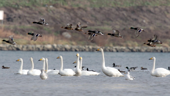 천연기념물 제201호·멸종위기야생동식물 2급으로 지정돼 보호받고 있는 겨울철새 큰고니 떼가 4일 오전 경북 포항시 남구 연일읍 유강리 형산강변에 날아와 휴식을 취하고 있다.