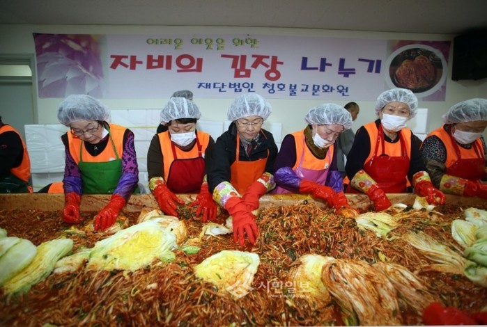 신연희 서울 강남구청장(가운데)이 최근 청호불교문화원에서 열린 ‘어려운 이웃을 위한 자비의 김장 나누기’ 행사에 참석해 자원봉사자들과 함께 1500포기의 김장을 담그고 있다.(사진제공=강남구청)