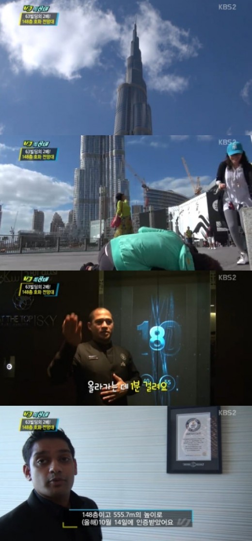 두바이에는 세계에서 손꼽히는 높은 빌딩인 부르즈 칼리파가 있다. 부르즈 칼리파는 148층, 총 555.7m 높이의 건물로 이 곳의 전망대는 올해 10월 가장 높은 전망대로 기네스북애 등재되기도 했다. 1층부터 148층까지 올라가는데 걸리는 시간이 불과 1분인 것으로 소개되기도 했다. 올라가는 비용은 한화로 12만원 가량이지만 두바이를 한 눈에 볼 수 있어 관광객들이 증가하는 추세다.