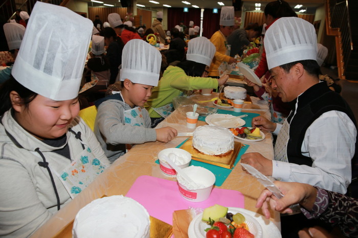 인천 남구 드림스타트는 지난 6일 구청 대회의실에서 드림스타트 아동 및 양육자 150여명이 참여한 가운데 성과보고 및 가족케이크 만들기 행사를 개최했다. 사진은 이날 참여한 드림스타트 가족들이 함께 케이크를 만들고 있는 모습. (사진제공=남구청)