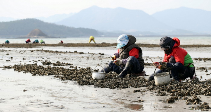 대설인 지난 7일 오전 전남 강진군 대구면 백사마을 강진만(灣) 바닷가에서 어민들이 통통하게 살이 오른 석화(石花)를 분주하게 채취하고 있다.