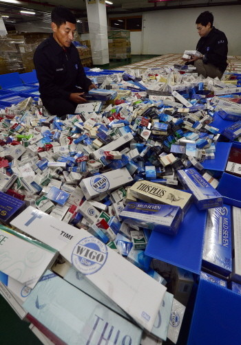 8일 오전 서울 강남구 서울세관 압수창고에서 세관 직원들이 압수된 면세 담배를 공개하고 있다. 관세청은 최근 간소화된 수출통관 절차를 악용한 담배밀수입이 급격히 증가하고 있고 내년 초 담배가격 인상을 계기로 해외 담배 밀수 등이 성행할 것으로 예상되어 밀수 등 불법행위 차단 종합대책을 이달부터 시행한다고 밝혔다.