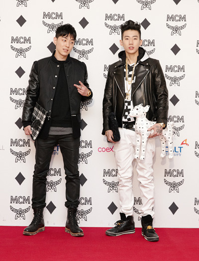 독일 럭셔리 브랜드 MCM이 5일 강남 코엑스 몰 <MCM LAB> 매장에서 플래그십 스토어 ‘MCM LAB’ 오픈 기념 파티행사를 연 가운데, 박재범과 그레이가 포토 월에서 인사를 하고 있다.