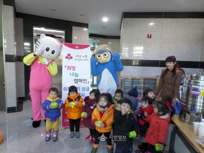 9일 충남 아산시 배방읍사무소에서 지역 주민들의 사회복지공동모금 참여를 확대하기 위한 '희망2015 나눔 캠페인 집중모금 행사'가 열렸다. 이날 행사에는 어린이들이 용돈을 모은 450여개의 저금통을 기부하며 어려운 이웃을 돕는 데 한 손을 보탰다. 사진은 저금통을 들고 모금에 참여한 어린이들의 모습. (사진제공=아산시청)