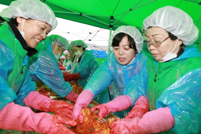 9일 경기 과천시 별양동 우물가에서 한국 수자원공사와 경기사회복지공동모금회의 후원으로 열린 '사랑의 김장 전달행사'에 신계용 과천시장이 참석해 지역내 저소득층 및 홀몸노인 200여가구에 전달할 사랑의 김치를 담그고 있는 모습. (사진제공=과천시청)