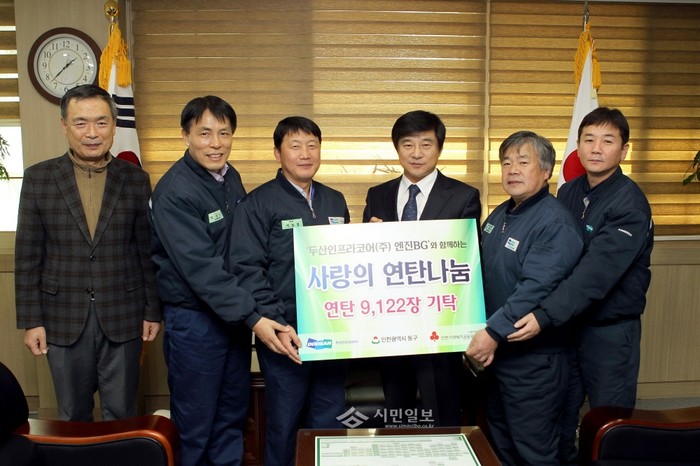 인천 동구는 지난 9일 '동절기 소외계층을 위한 사랑의 연탄 전달식'을 열고 두산인프라코어로부터 연탄 연탄 9122장을 전달받았다. 이 연탄은 지역내 소외계층 34가구와 동구지체장애인협회에 전달될 예정이다. 사진은 전달식에 참석한 이흥수 구청장(오른쪽 3번째) 와 관계자들이 전달식 기념촬영을 하고 있는 모습. (사진제공=동구청)