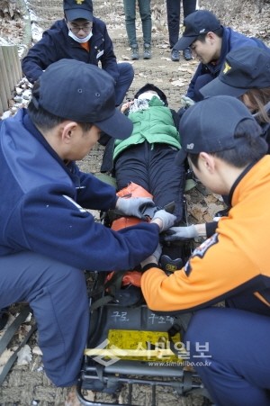 지난 8일 서울 구로구 개봉동에 위치한 개웅산 정산 부근에 출동한 구로소방서 대원들이 낙상에 의한 발목염좌로 거동이 불편한 유 모씨(56·여)를 응급처치하고 안전하게 구조작업을 하고 있다. (사진제공=구로소방서)